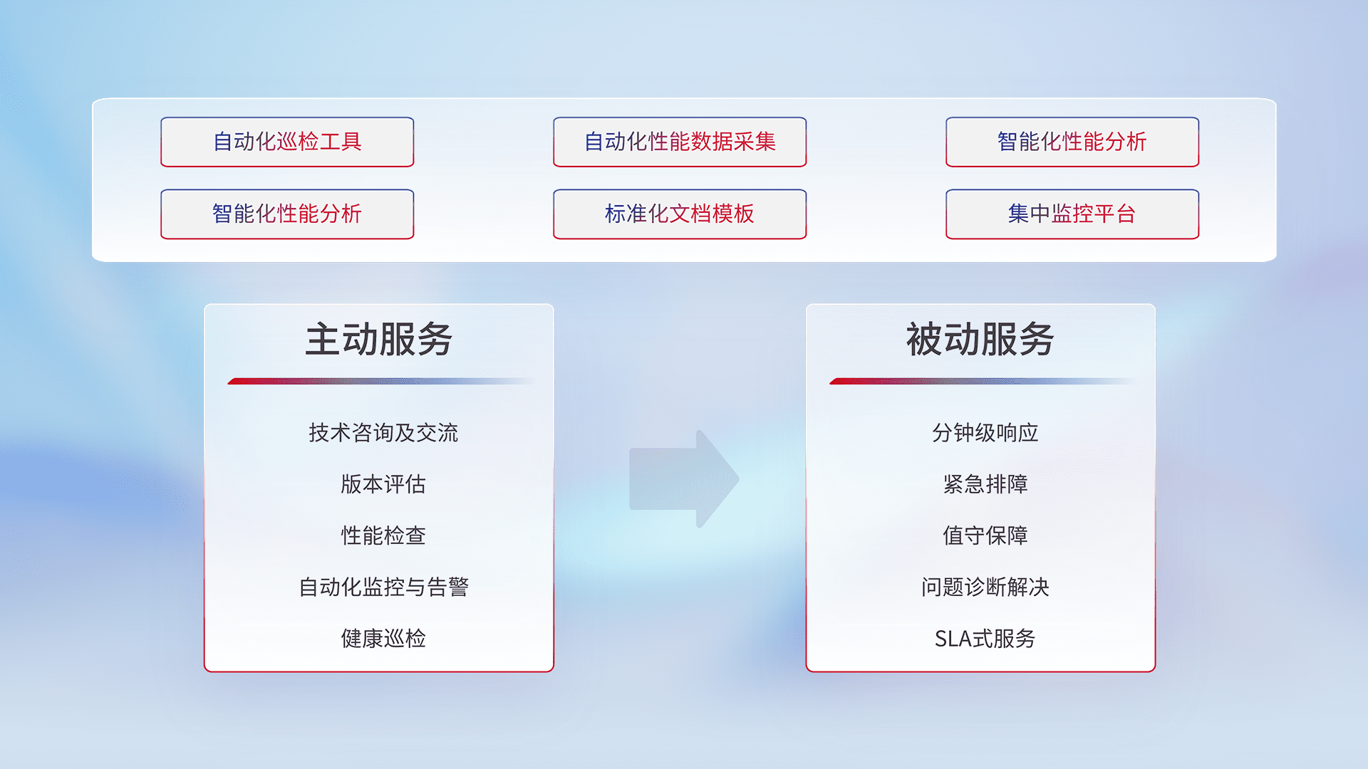 智能化工具和标准化文档,,保障服务质量,,提供主动服务(包含技术咨询、、、、版本评估、、性能检查、、、、自动化监控与告警、、、健康巡检)和被动服务包含(分钟级响应、、紧急排障、、、、值守保障、、、问题诊断解决、、、SLA服务)。。。。