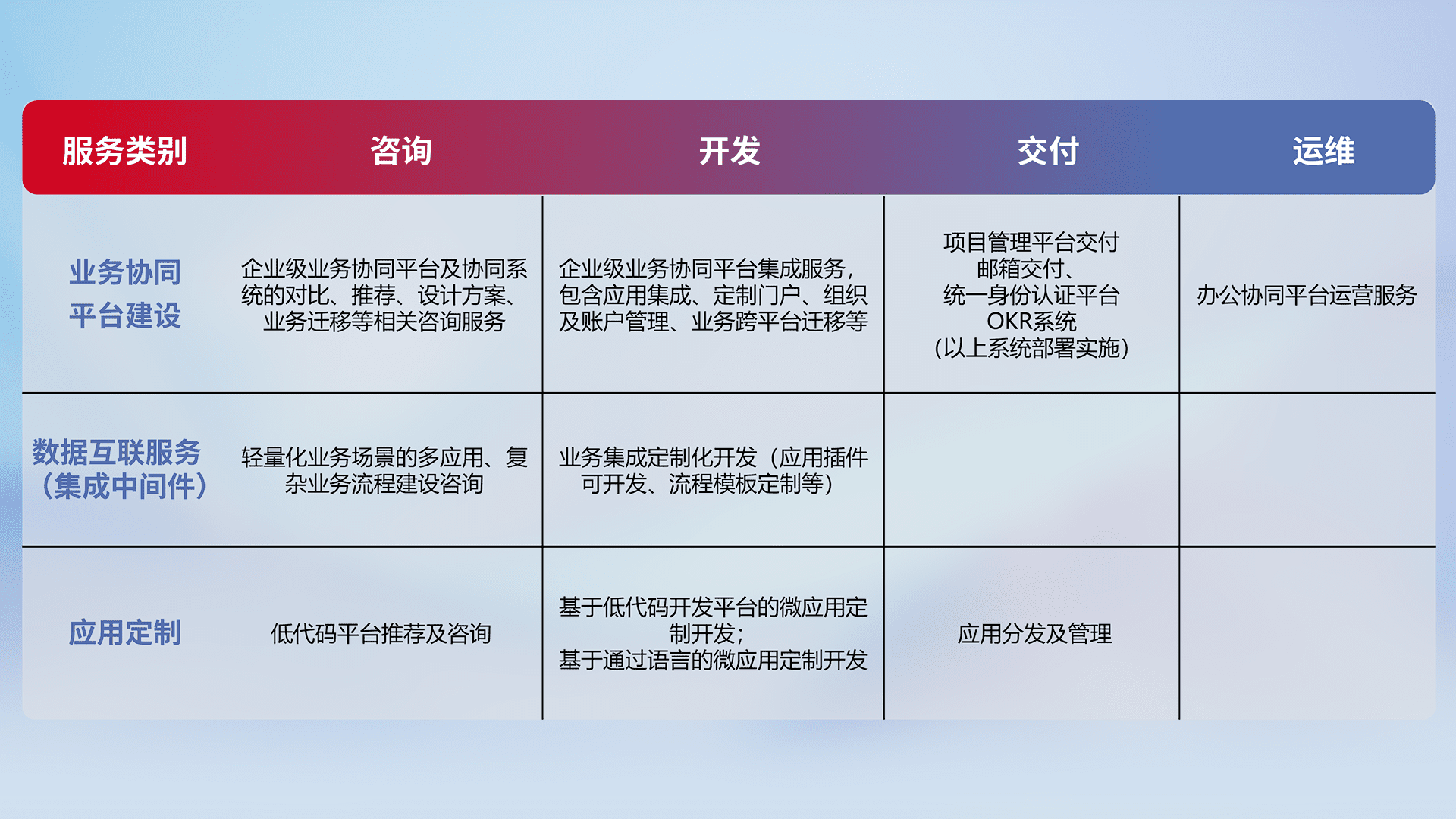 针对钉钉、、、、企微、、、、IDaas等平台级产品提供产品的规划、、、方案、、、、交付、、、、定制化开发等服务,,实现如统一协同办公、、智能客户服务、、混合会议管理、、、、智能数据查询、、、等业务场景,,,,实现数字化转型。。